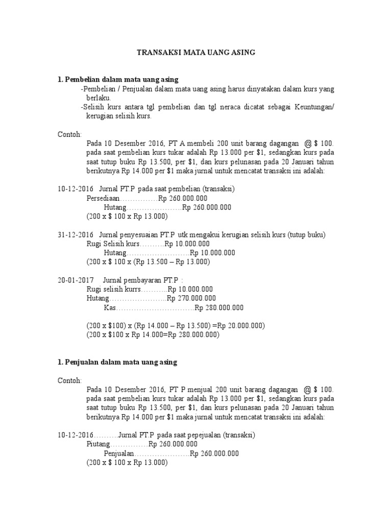 Contoh Soal Transaksi Mata Uang Asingreviews. Kurs valuta asing perlu dipelajari, karena dalam dunia ekonomi terkadang transaksi akan dilakukan dengan seseorang dari belahan dunia lain. Pendapatan dan beban dalam mata uang asing umumnya ditranslasikan dengan menggunakan kurs nilai tukar yang berlaku pada saat pos-pos tersebut diakui.